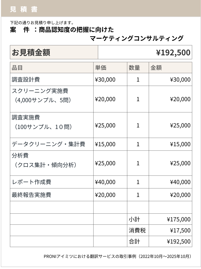 商品認知度の把握に向けたマーケティングコンサルティングの費用は、17万5,000円(税込)でした。マーケティングコンサルティングの相場(月額50万〜120万円程度)と比べて安価なのは、継続的な施策立案ではなく、単発のリサーチ業務に支援範囲を絞っているためです。一般的に、調査設計から実施、分析までを含むマーケティングリサーチの費用相場は20万〜50万円程度とされており、本事例は相場の下限水準にあたります。