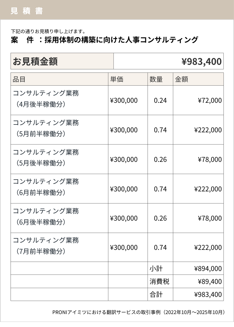 ※本見積書は、当社PRONIアイミツの取引事例をもとに見積書を再現したものです。また、数量欄の数値(0.24、0.26、0.74)は、1ヵ月を1.0とした際の稼働割合を示しています。月内の業務量に応じて稼働を配分しており、合計が1.0の場合は1ヵ月分の費用となります。