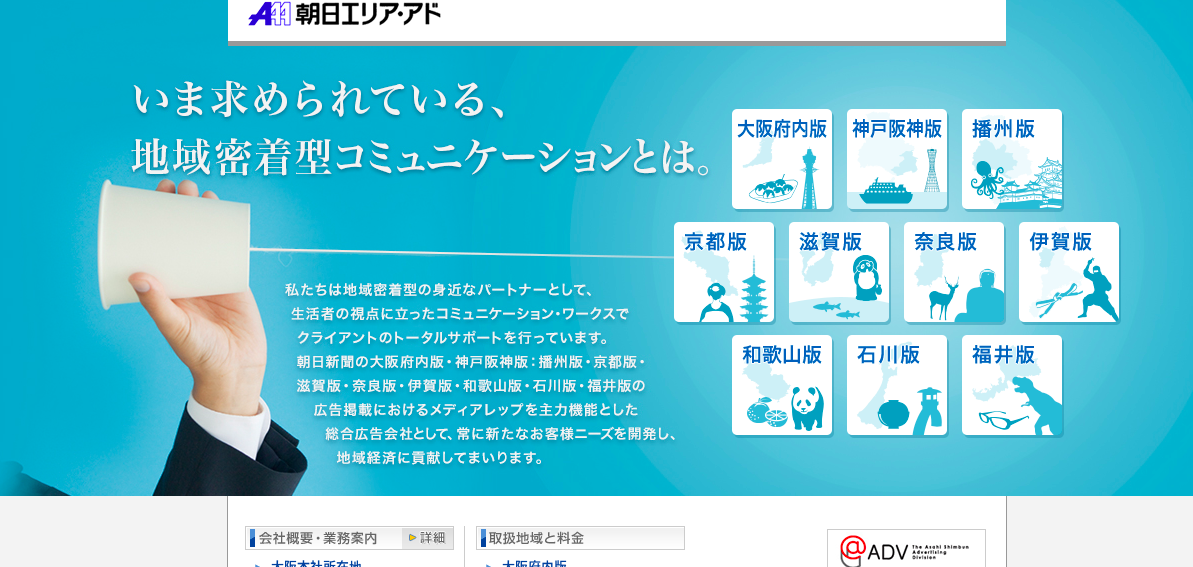 - 株式会社朝日エリア・アドは朝日新聞大阪府内版・神戸阪神版などの広告掲載におけるメディア・レップを主力機能とした総合広告会社として、営業力の一層の強化を図り、クライアントのニーズに応え、地域経済の活性化に貢献しております。