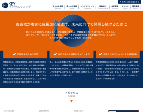 KEYコンサルティングは神奈川県横浜市を拠点とし、税務や会計の諸問題から日常的な課題まで責任をもって対処するコンサルティング会社です。社名の「KEY」には「重要な物事を解決する手掛かり」といった意味があり、お客様の課題を解決する「KEY」を見極め、最善策を効果的にご提供します。企業再編(合併、会社分割、事業譲渡、株式交換、株式移転など)、事業承継(相続税対策、後継者対策、各種スキーム立案・実行、遺言対応など)、M&A関連業務(スキーム立案、FA業務、税務検証及び申告、実行サポートなど)、事業再生(民事再生、会社更生、破産、特別清算、私的整理ガイドライン、ADR、RCC、産業再生機構、REVIC、中小企業再生支援協議会、産活法活用スキームなど)を得意としています。