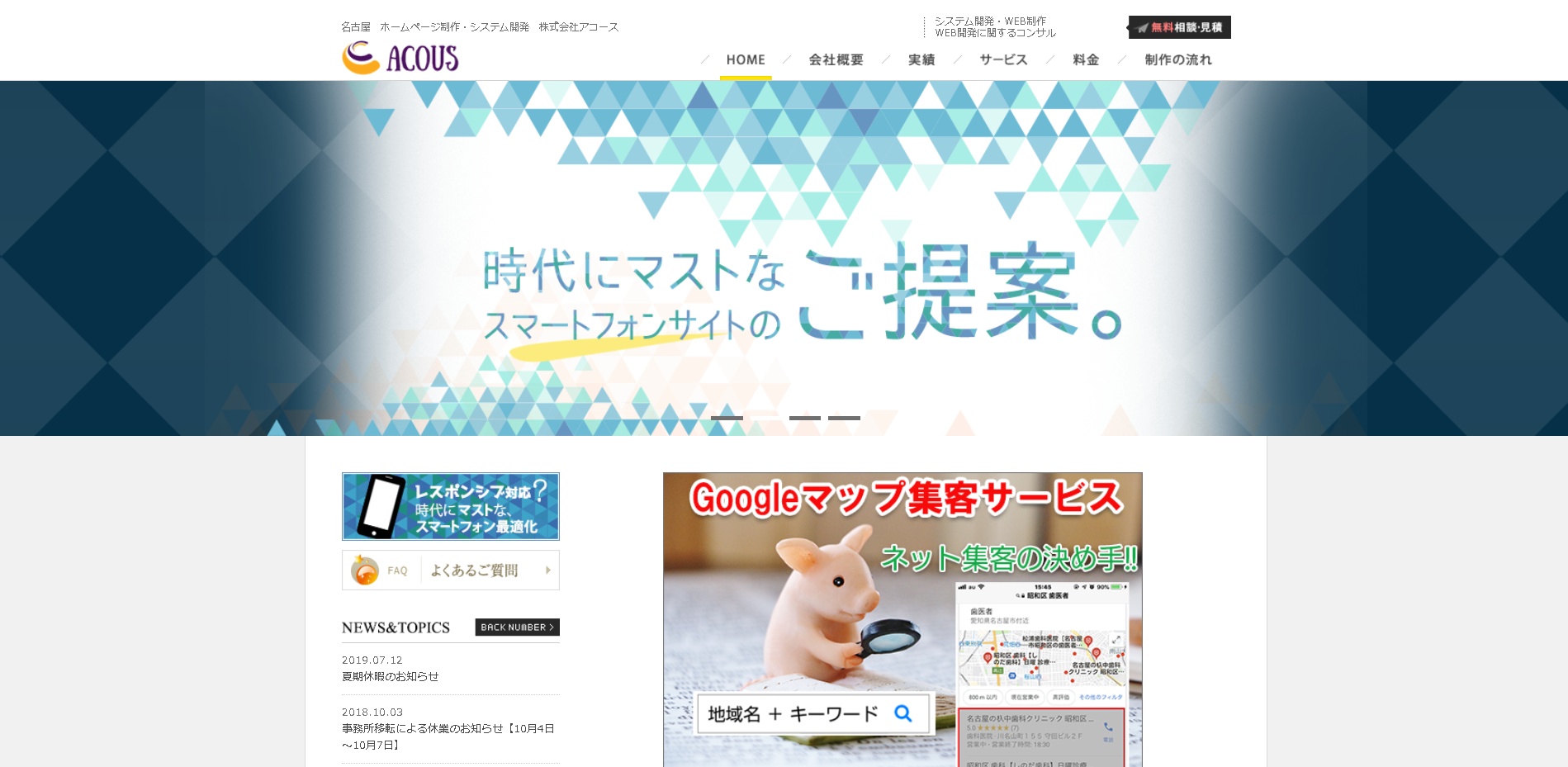 株式会社アコースは愛知県名古屋市にある会社で、ホームページの企画制作をはじめアプリ開発やwebシステムの開発などさまざまな事業を展開しています。ホームページの制作を得意とするだけでなく、検索ニーズや競合他社の分析といった調査も得意とするところ。クライアントの顔となるホームページのデザインも、単純に見やすさだけでなく機能性を追求したものを提供しています。スマートフォン向けサイトの開発においては、現在主流となっているレスポンシブデザイン対応のサイトを開発。手のひらに収まるスマートフォンに適した文字サイズや、指を動かした際の画面の動きのスムーズさに素早く対応できるサイトを提供しています。