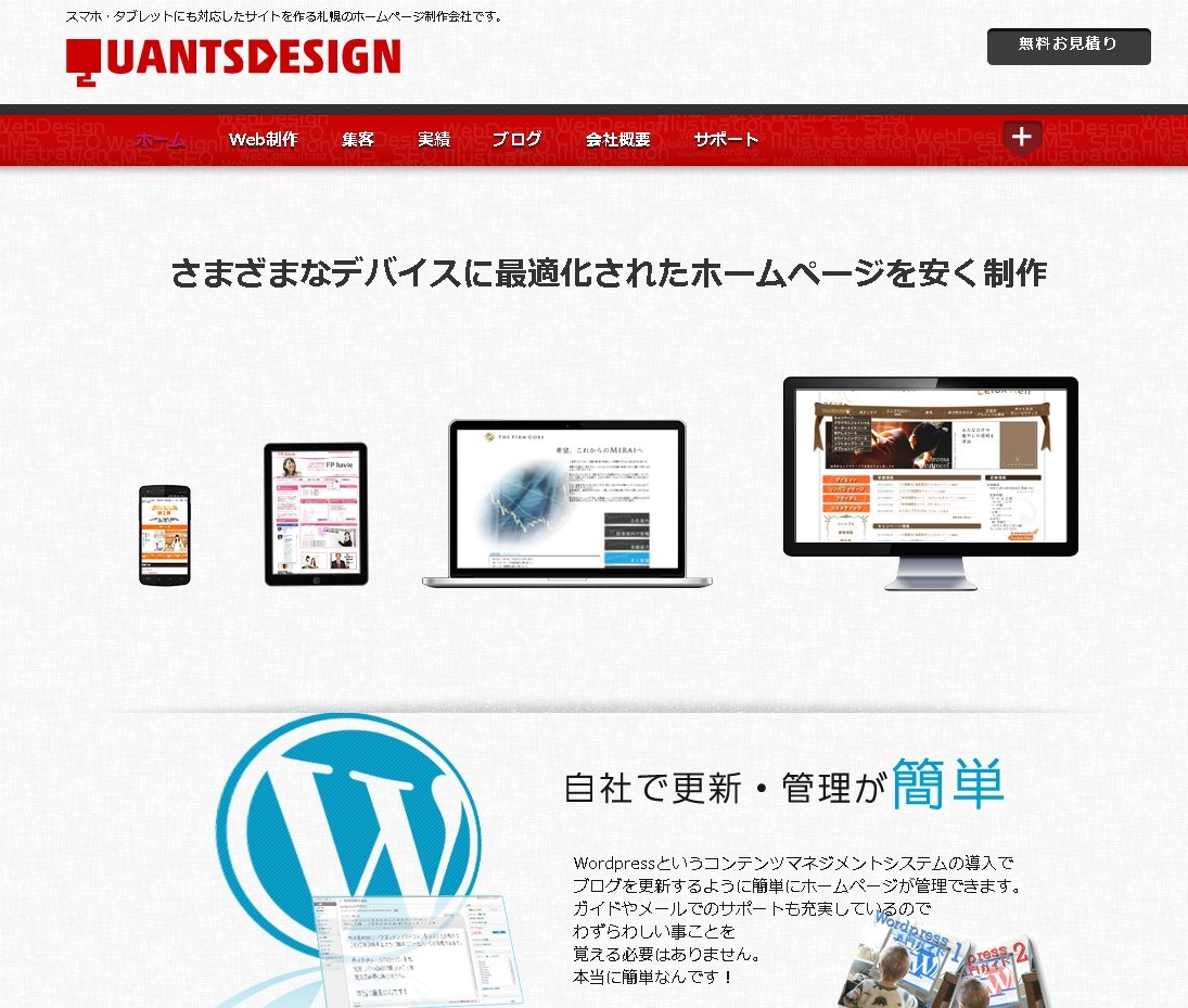 クオンツデザインは、札幌市を拠点に、ホームページ制作やインターネットにおけるプロモーション支援を行っています。 リーズナブルながらもオーダーメイドのデザインでホームページを制作でき、各種ページやメールフォーム、サーバー・ドメイン管理などのサービスが一体となったパックプランを用意しています。 WordPressなどのCMS導入で更新機能が使えるようになり、内部SEO・外部SEO対策やGoogleMapの設置を行ってもらえる点も魅力。 デザインや構造が古くなったページのリニューアルや、専門知識がないために更新が困難なケースにも対応。レスポンシブデザインへの書き換えも行っており、スマホからの閲覧に配慮したホームページを提供可能です。