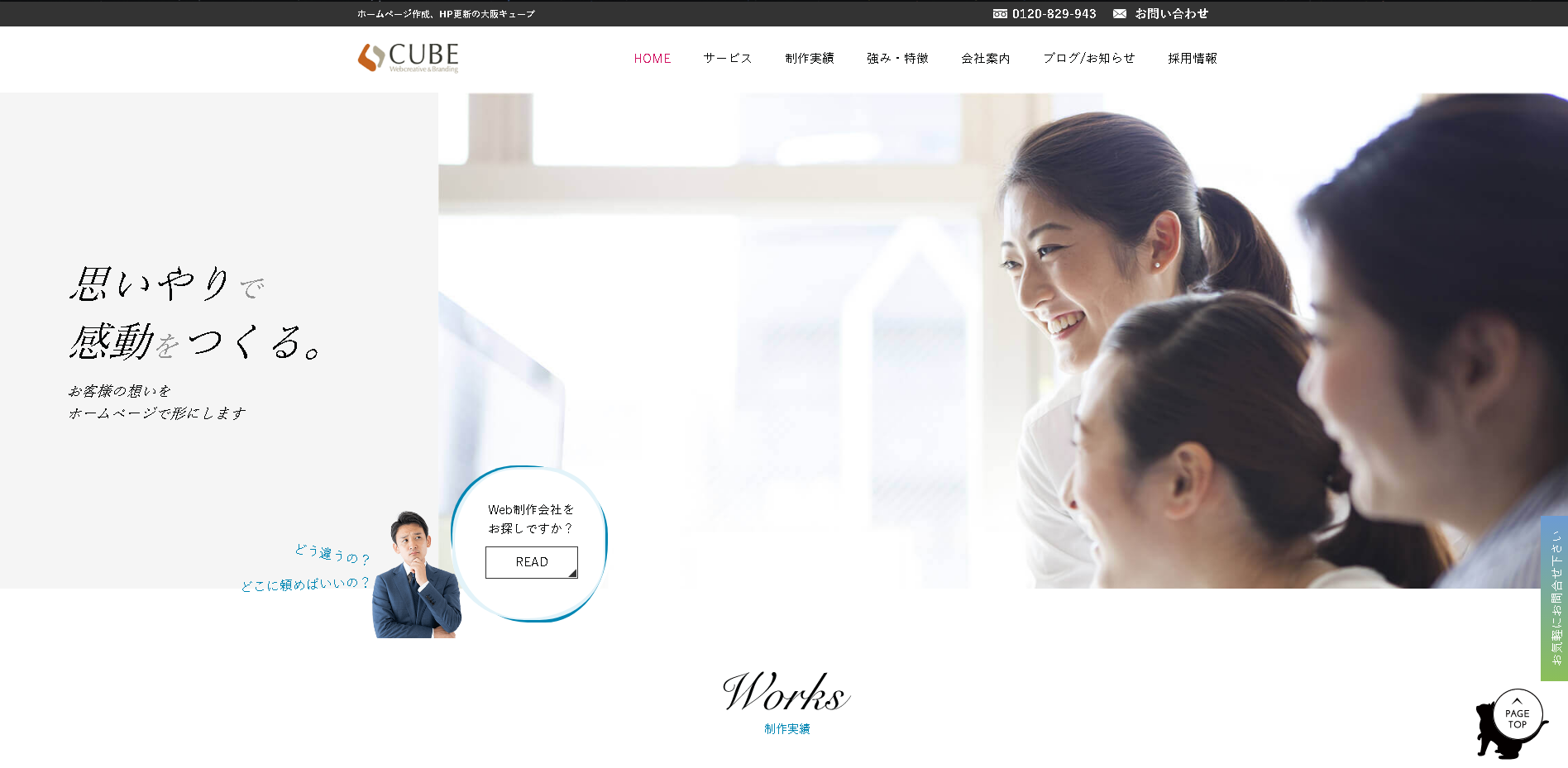 株式会社キューブは大阪府大阪市に拠点を置くホームページ制作会社です。コーポレートサイト、採用・求人サイト、スマホ・モバイルサイトなど4種類のサイト制作に対応しており、飲食店・居酒屋、病院・歯科・医療、大学・学校など3種類の業界に対応しています。対応している業務はブランディング、広告、リニューアルなど6種類あります。ASP/CMSはEC-CUBEなどに対応しています。