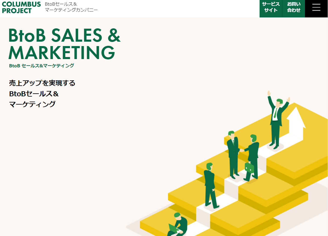 コロンバスプロジェクトは東京都千代田区に拠点を置くコンサルティング会社です。主な事業内容としてBtoBセールス、Webマーケティング、広告運用、ECなどに関するコンサルティングを行っています。大きな強みはBtoBビジネスに対する営業サポートです。戦略の立案から営業代行までワンストップで行うことができ、これまで一部上場企業を含め多数の取引実績があります。顧客との接点創出、アポイントの獲得、テレマーケティングによるリサーチなど、新規顧客の獲得から成約獲得までのプロセスに一貫して対応できるほか、トークスクリプトや営業ツール・販促ツールの作成も行っています。多数のKPI達成や数値向上を実現してきたノウハウを活かし、既存の営業組織の改善などの依頼にも対応することができます。セールス・マーケティング全般に強い会社です。