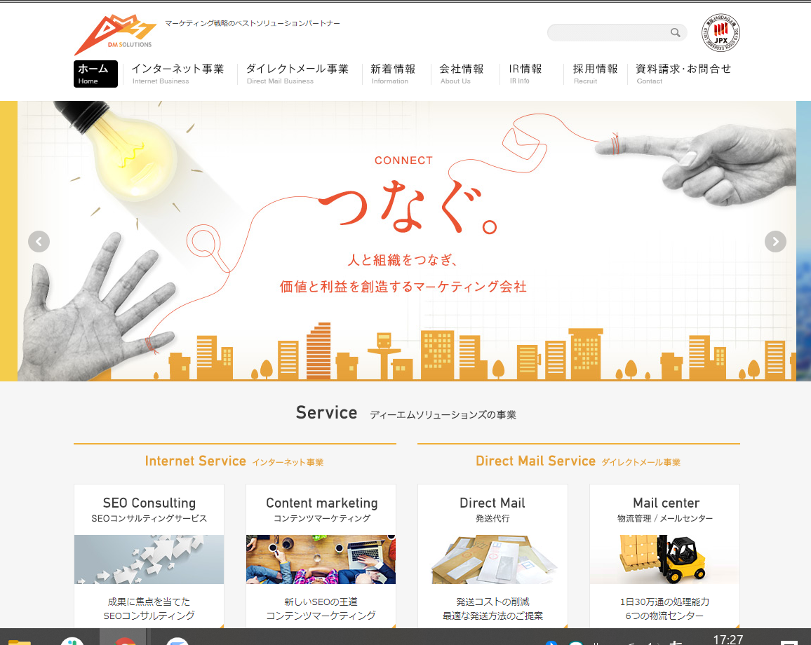 ディーエムソリューションズは、インターネット事業とダイレクトメール事業を2本の柱として展開する会社で、東京都武蔵野市に本社、横浜・名古屋・大阪・福岡・仙台に営業所を持っています。