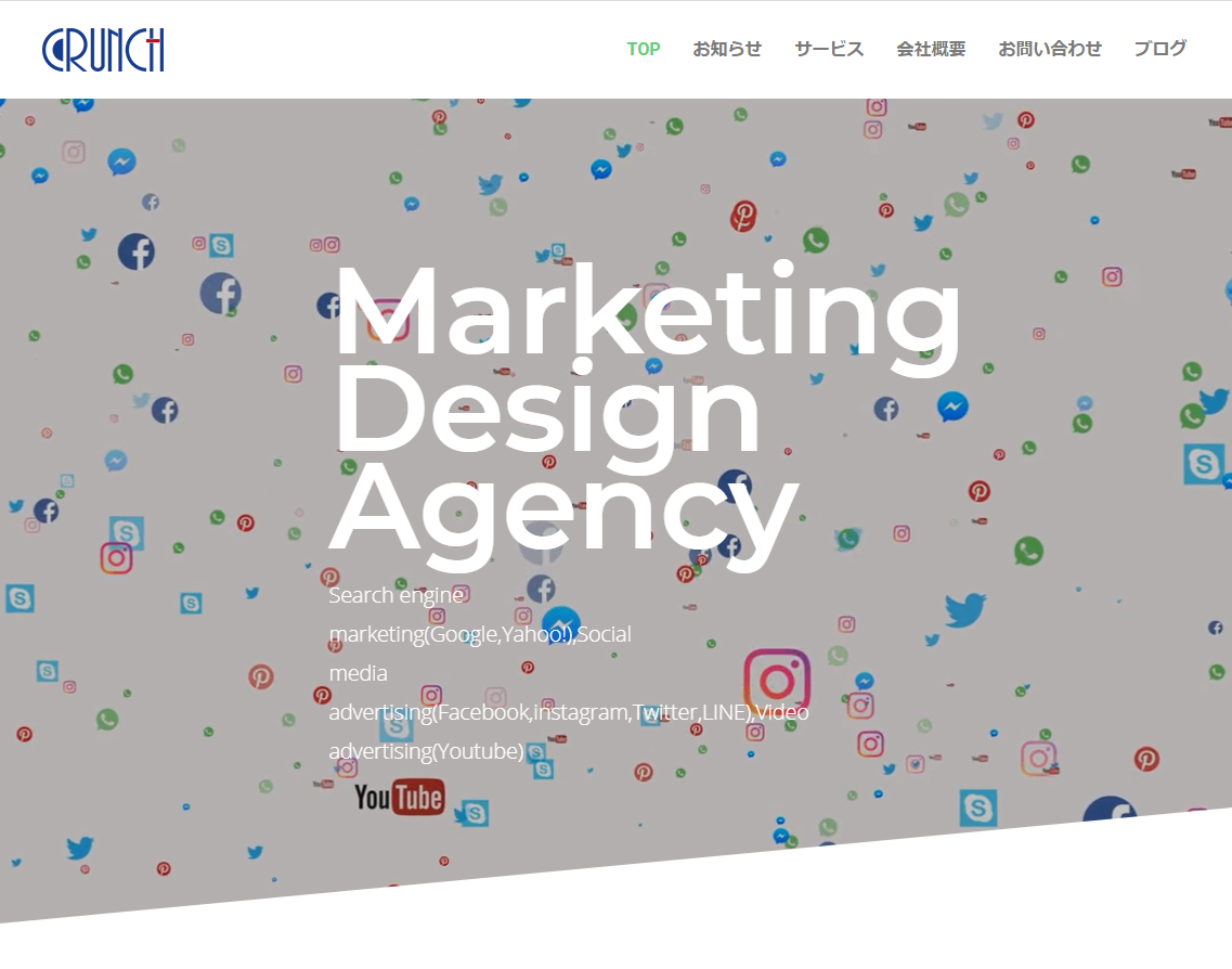 Crunchは東京都品川区にオフィスを置くWebコンサルティング会社です。主な事業内容として広告代理業、インターネット広告、Web解析、クリエイティブ制作、インフルエンサーマーケティングなどに関連したサービスを提供しています。大きな強みは豊富な広告運用経験を活かした充実のサポート体制です。リスティング広告をはじめ、SNS広告や動画広告など様々なインターネット広告の運用を行ってきた長年の経験から、業種や業界を問わずクライアントに最適な提案を行うことが可能です。自社でクリエイティブ制作も行っているため、提案・制作・運用までワンストップで対応できる点も大きな強みです。また海外への広告出稿にも対応することができ、英語・中国語に対応したインターネット広告の運用を行うことが可能です。またLPの制作なども行っています。