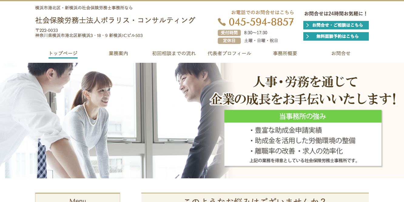 ポラリス・コンサルティングは神奈川県横浜市北区に本社を構える、人事・労務・助成金などのコンサルティングや、助成金の申請など各種手続きの代行サービスを提供する社会保険労務士事務所です。人事コンサルティングなどのサービスは主に顧問サービスの一環として提供しており、LINEやチャットサービスを活用し、気軽に質問でき、回答もスピーディーなのが特徴です。特に助成金受給については、総額で一億円を超えるほどの件数を成功させた実績があり、助成金制度について豊富な知識と経験を持っています。また会社の成長の妨げとなる、労使間のトラブルを防ぐノウハウも豊富です。人事制度の構築などの労務管理の面から理想の会社作りを徹底的にサポートする社会保険労務士事務所です。
