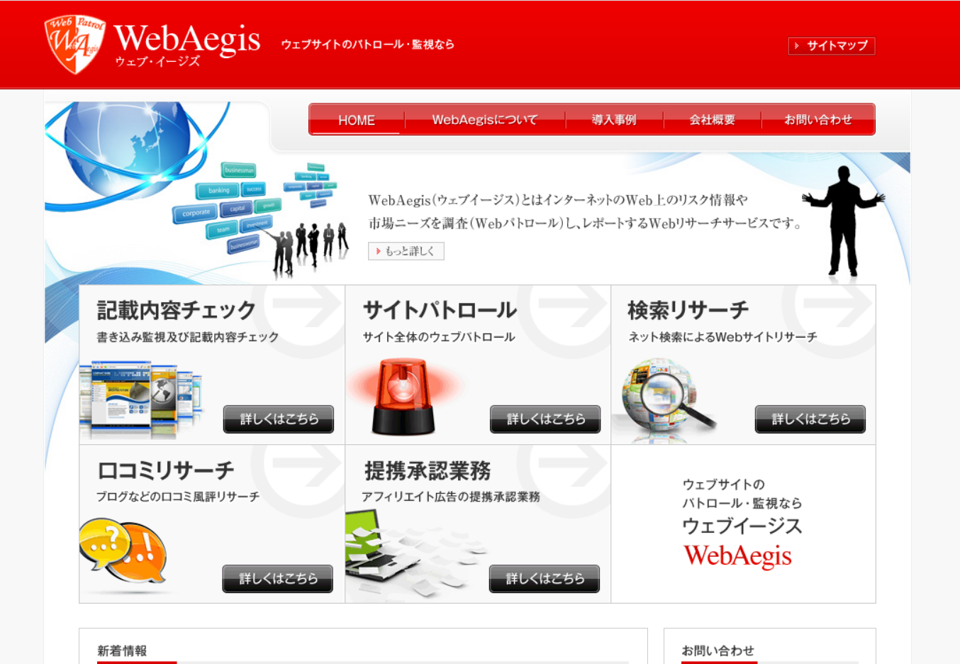 ウェブサイトのパトロール・監視なら「ウェブイージス」。書き込み監視や記載内容チェック、サイト全体のウェブパトロール、ネット検索によるWebサイトリサーチ、ブログなどの口コミ風評リサーチなどのサービスを取り扱っております。