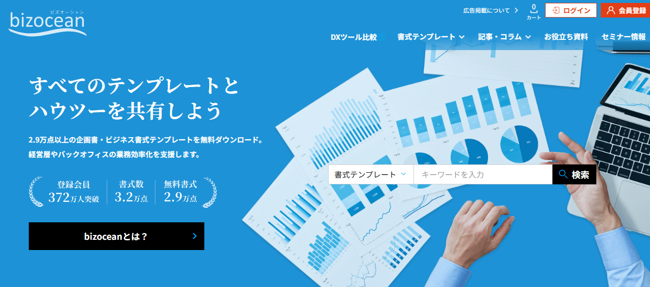 bizoceanは日本最大級のビジネステンプレートサイトで、サイトマップを含む数万点の書式テンプレートを無料または低コストでダウンロードできます。Webサイト設計の骨子を素早くまとめたい人や、ExcelやPowerPointに馴染みのある制作担当者に特に向いているサービスです。