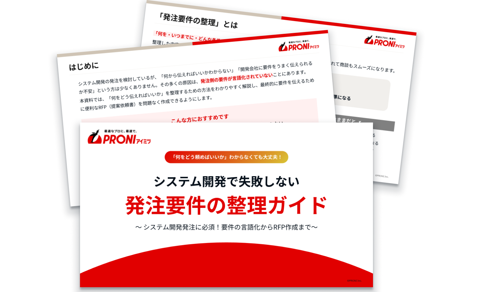 B2B受発注プラットフォーム「PRONIアイミツ」を運営するPRONI株式会社が、60万件超の相談実績から得られたノウハウをもとに書き下ろしたものです。要件が言語化できず発注先への相談に踏み切れずにいるビジネスパーソンに向けて、要点を絞りまとめています。